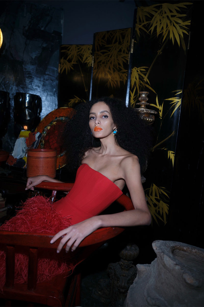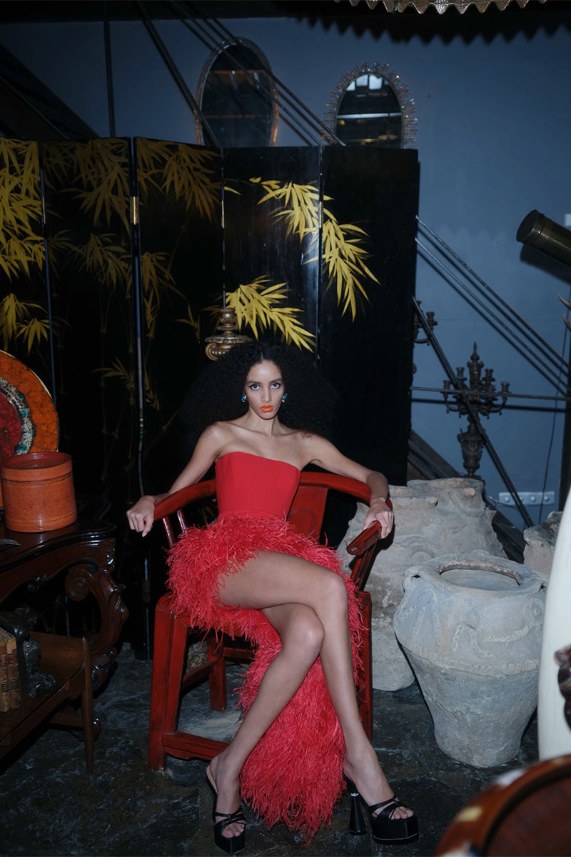 All of the feathers are 100% dyed ostrich feathers. They are produced with full commitment to the framework of sustainable production and are supplied from certified farms. Store in a cool and dry environment. Keep away from water and moisture to avoid discoloration. Since the feathers are not synthetic, it is expected that some amount of shedding will occur. All of the feathers are hand stitched to the dress. Before handing over the dress for dry cleaning, the feathers should be removed and sewn again after the dress has been cleaned.