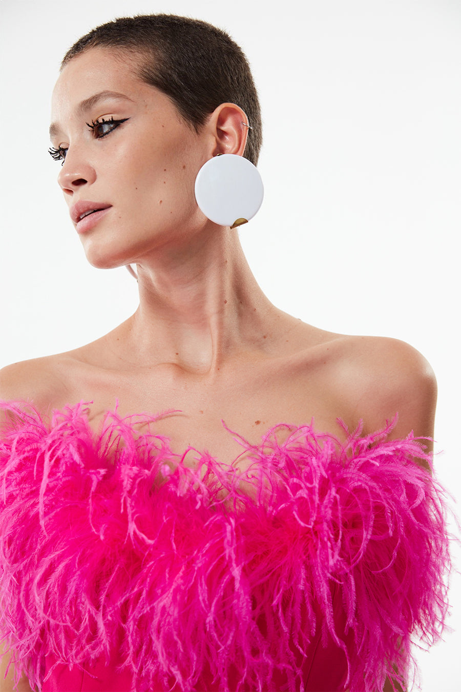 All of the feathers are 100% dyed ostrich feathers. They are produced with full commitment to the framework of sustainable production and are supplied from certified farms. Store in a cool and dry environment. Keep away from water and moisture to avoid discoloration. Since the feathers are not synthetic, it is expected that some amount of shedding will occur. All of the feathers are hand stitched to the dress. Before handing over the dress for dry cleaning, the feathers should be removed and sewn again after the dress has been cleaned.