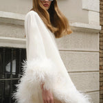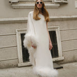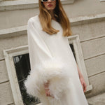 All of the feathers are 100% ostrich feathers. They are produced with full commitment to the framework of sustainable production and are supplied from certified farms. Store in a cool and dry environment. Since the feathers are not synthetic, it is expected that some amount of shedding will occur. All of the feathers are hand stitched to the dress. Before handing over the dress for dry cleaning, the feathers should be removed and sewn again after the dress has been cleaned.