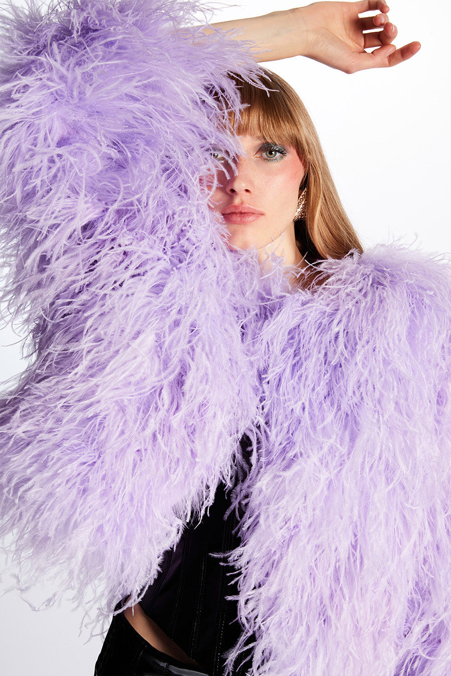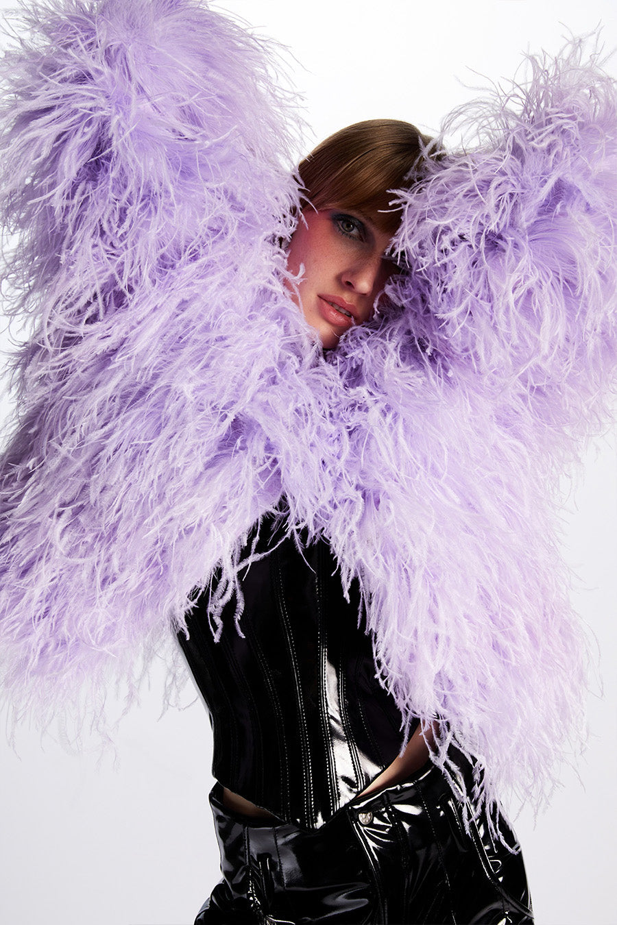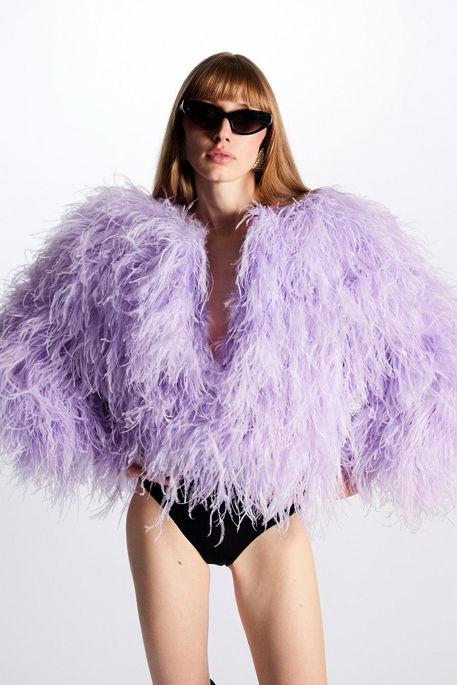 All of the feathers are 100% dyed ostrich feathers. They are produced with full commitment to the framework of sustainable production and are supplied from certified farms. Store in a cool and dry environment. Keep away from water and moisture to avoid discoloration. Since the feathers are not synthetic, it is expected that some amount of shedding will occur. All of the feathers are hand stitched to the dress. Before handing over the dress for dry cleaning, the feathers should be removed and sewn again after the dress has been cleaned.