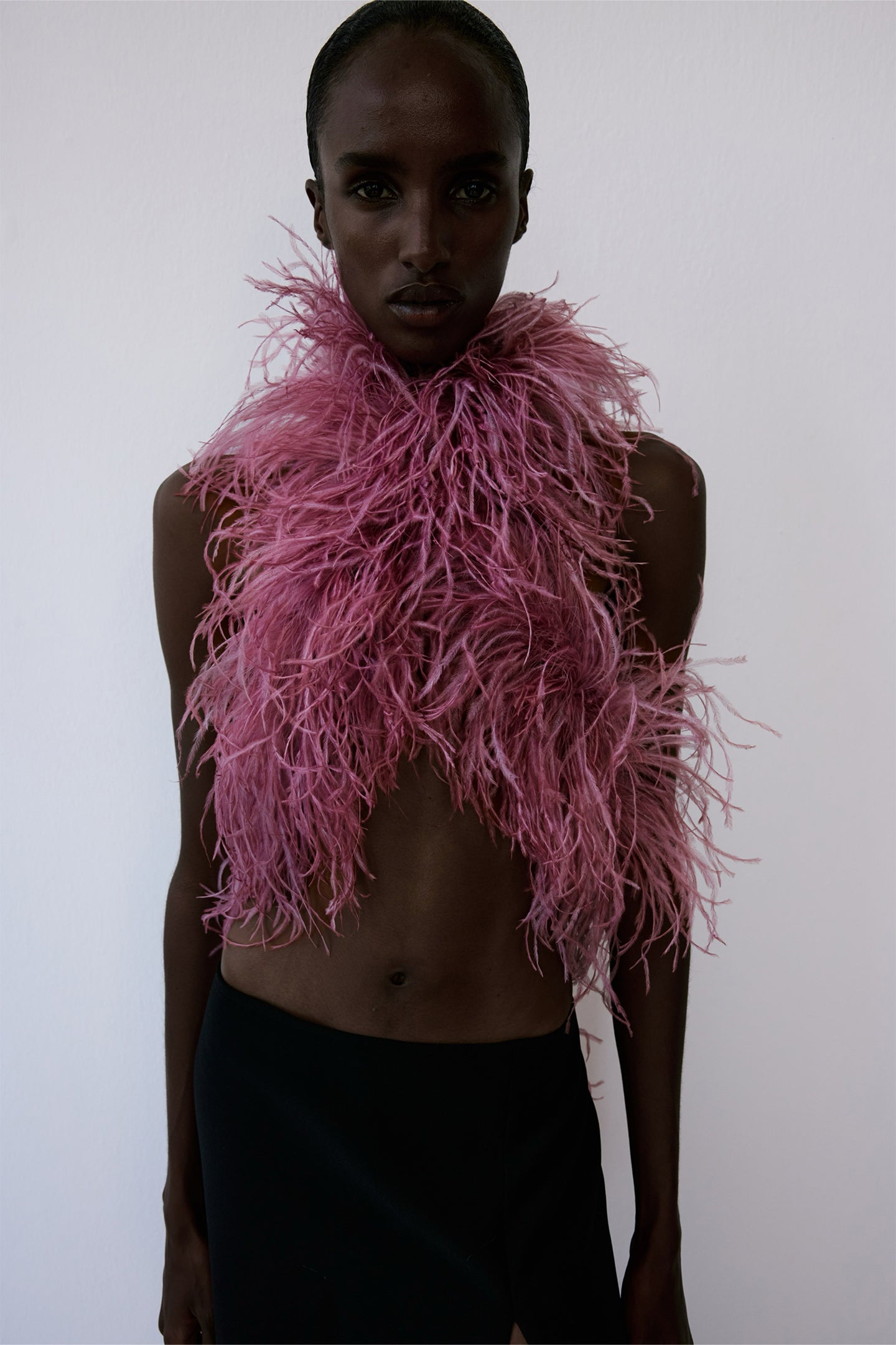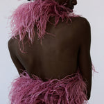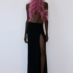 All of the feathers are 100% ostrich feathers. They are produced with full commitment to the framework of sustainable production and are supplied from certified farms. Store in a cool and dry environment. Since the feathers are not synthetic, it is expected that some amount of shedding will occur. All of the feathers are hand stitched to the dress. Before handing over the dress for dry cleaning, the feathers should be removed and sewn again after the dress has been cleaned.