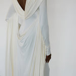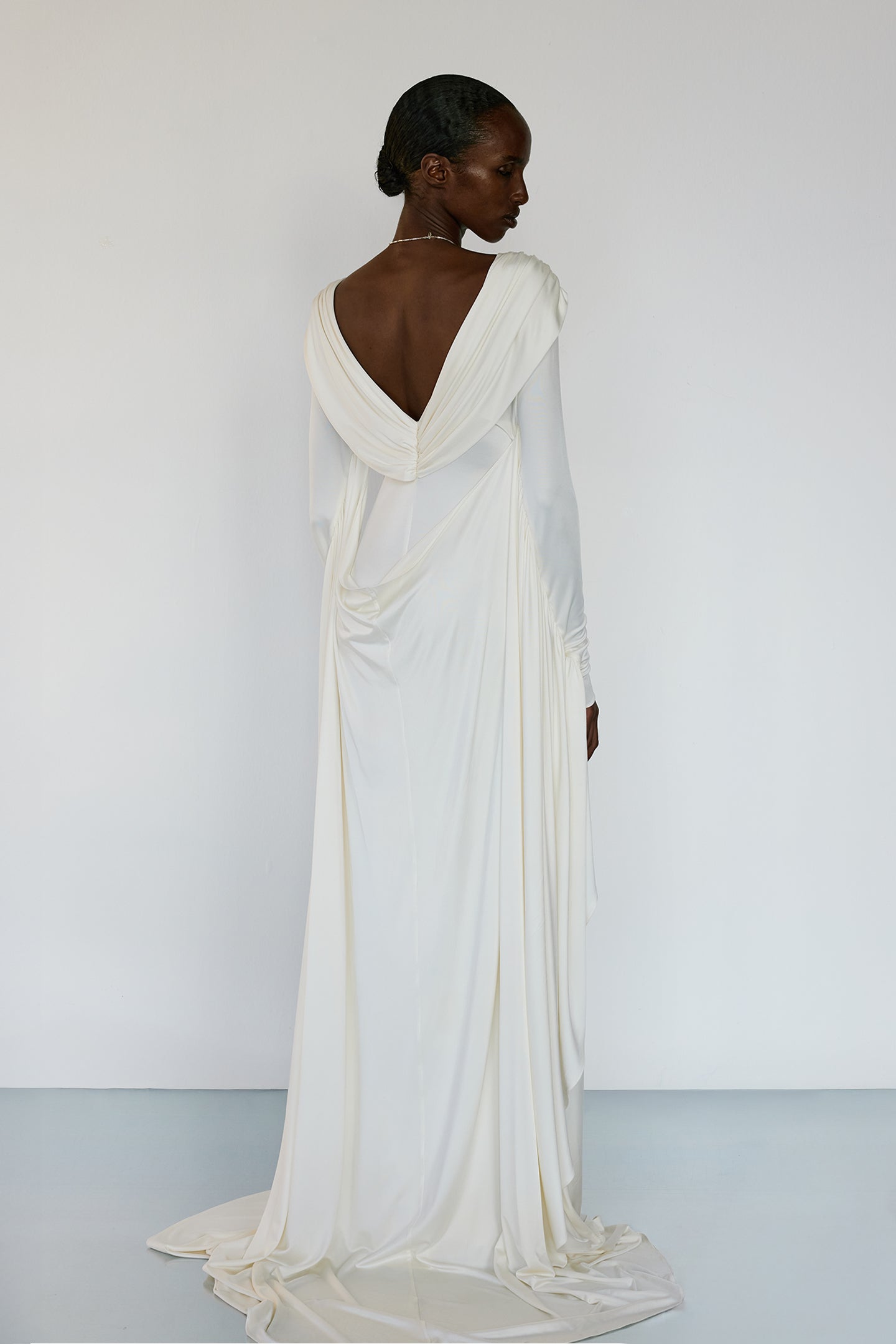 • Boat neckline, long sleeves with drape panels, open-back detail