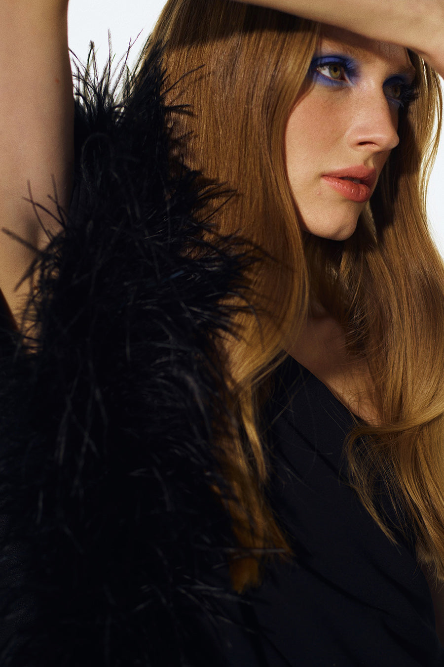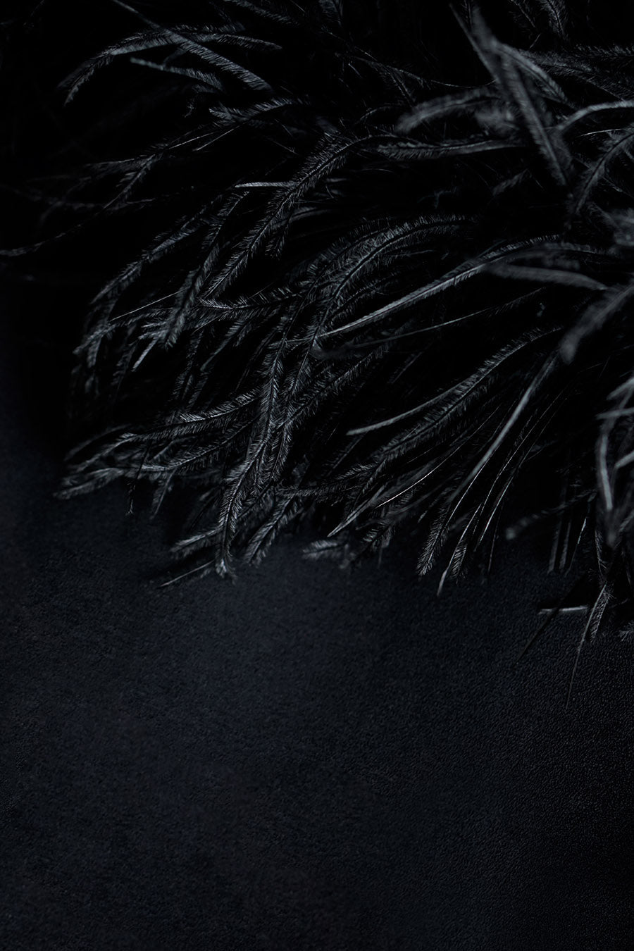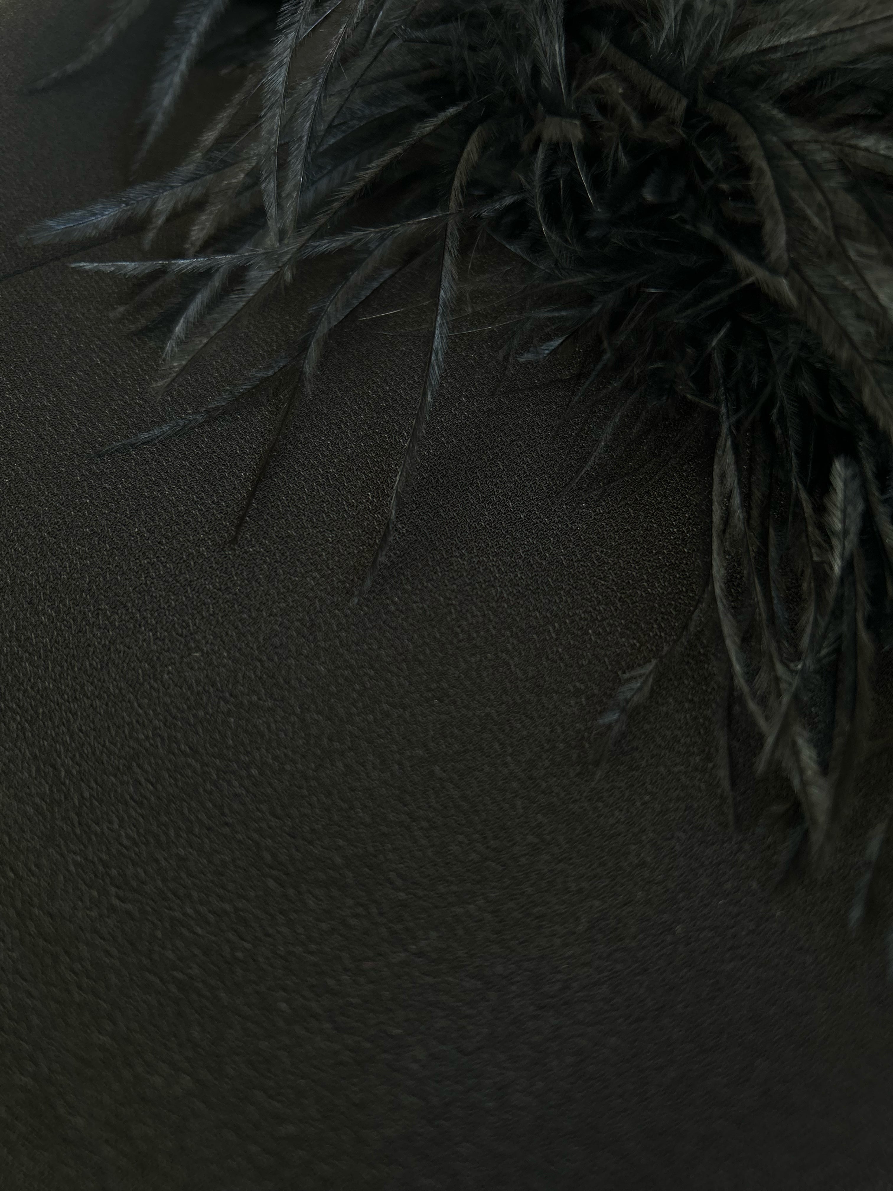 Toutes les plumes sont des plumes d'autruche 100 % teintées. Elles sont produites dans le respect total du cadre de production durable et proviennent d'exploitations agricoles certifiées. Conserver dans un environnement frais et sec. Tenir à l'écart de l'eau et de l'humidité pour éviter toute décoloration. Les plumes n'étant pas synthétiques, il est probable qu'elles perdent un peu de poils. Toutes les plumes sont cousues à la main sur la robe. Avant de remettre la robe au nettoyage à sec, les plumes doivent être retirées et recousues après le nettoyage de la robe.