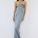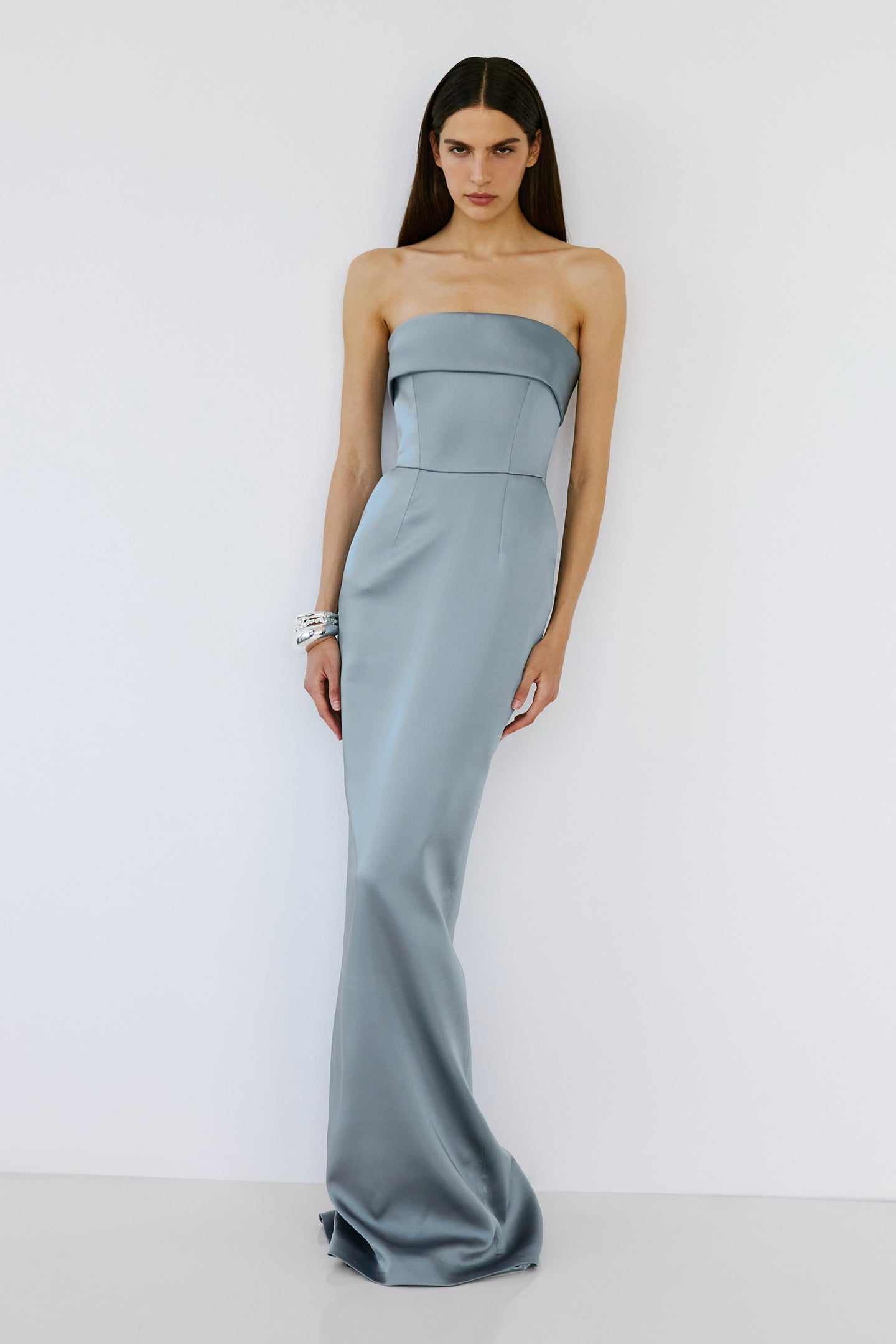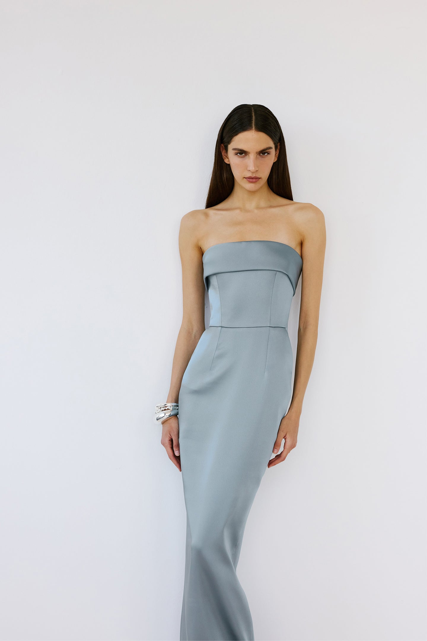 - Strapless column gown with clean, structured bodice