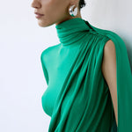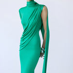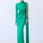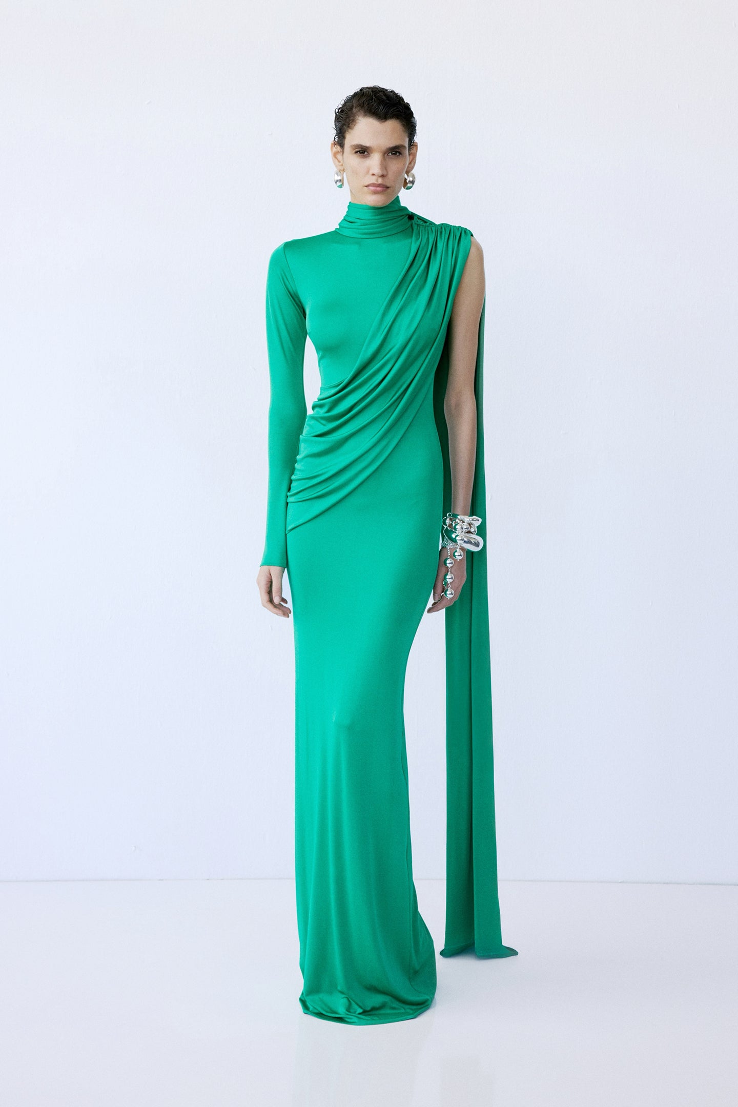 - Asymmetric long-sleeve silhouette