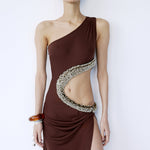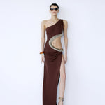- Asymmetric one-shoulder neckline