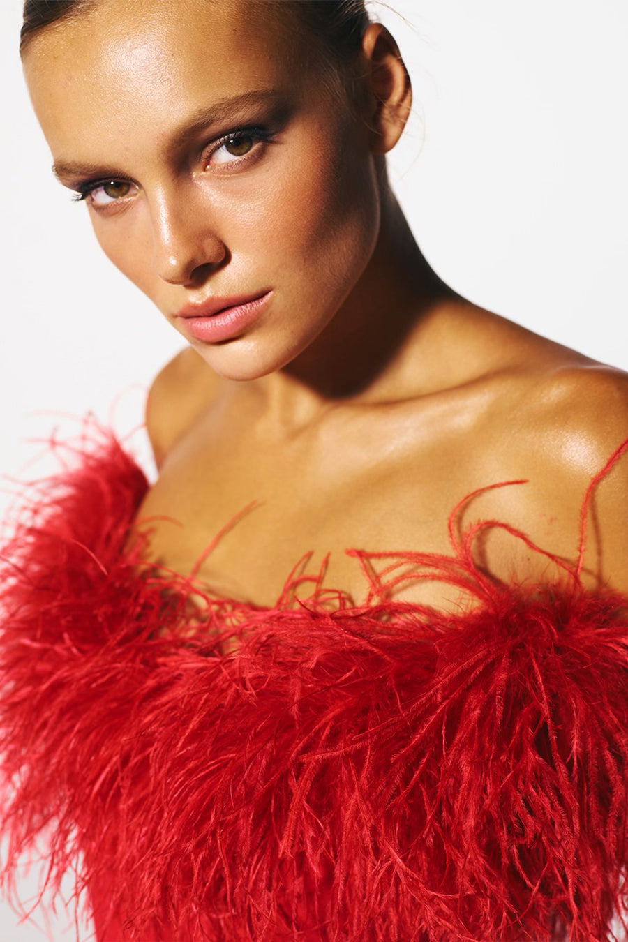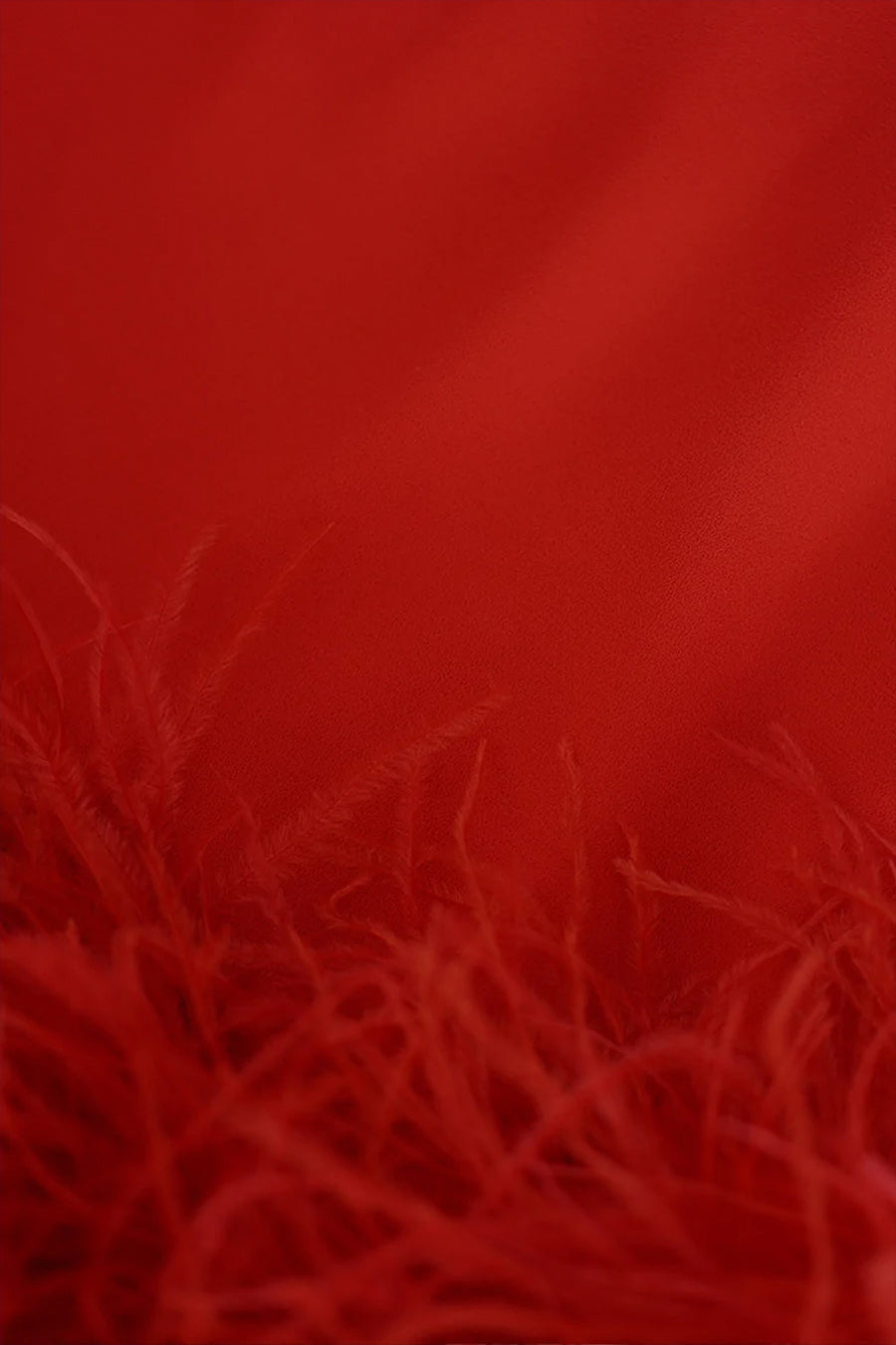 Tutte le piume sono piume di struzzo tinte al 100%. Sono prodotte con il pieno impegno nel quadro della produzione sostenibile e provengono da allevamenti certificati. Conservare in un ambiente fresco e asciutto. Tenere lontano da acqua e umidità per evitare scolorimenti. Poiché le piume non sono sintetiche, è previsto che si verifichi una certa quantità di perdita. Tutte le piume sono cucite a mano all'abito. Prima di consegnare l'abito per la pulizia a secco, le piume devono essere rimosse e cucite di nuovo dopo che l'abito è stato pulito.