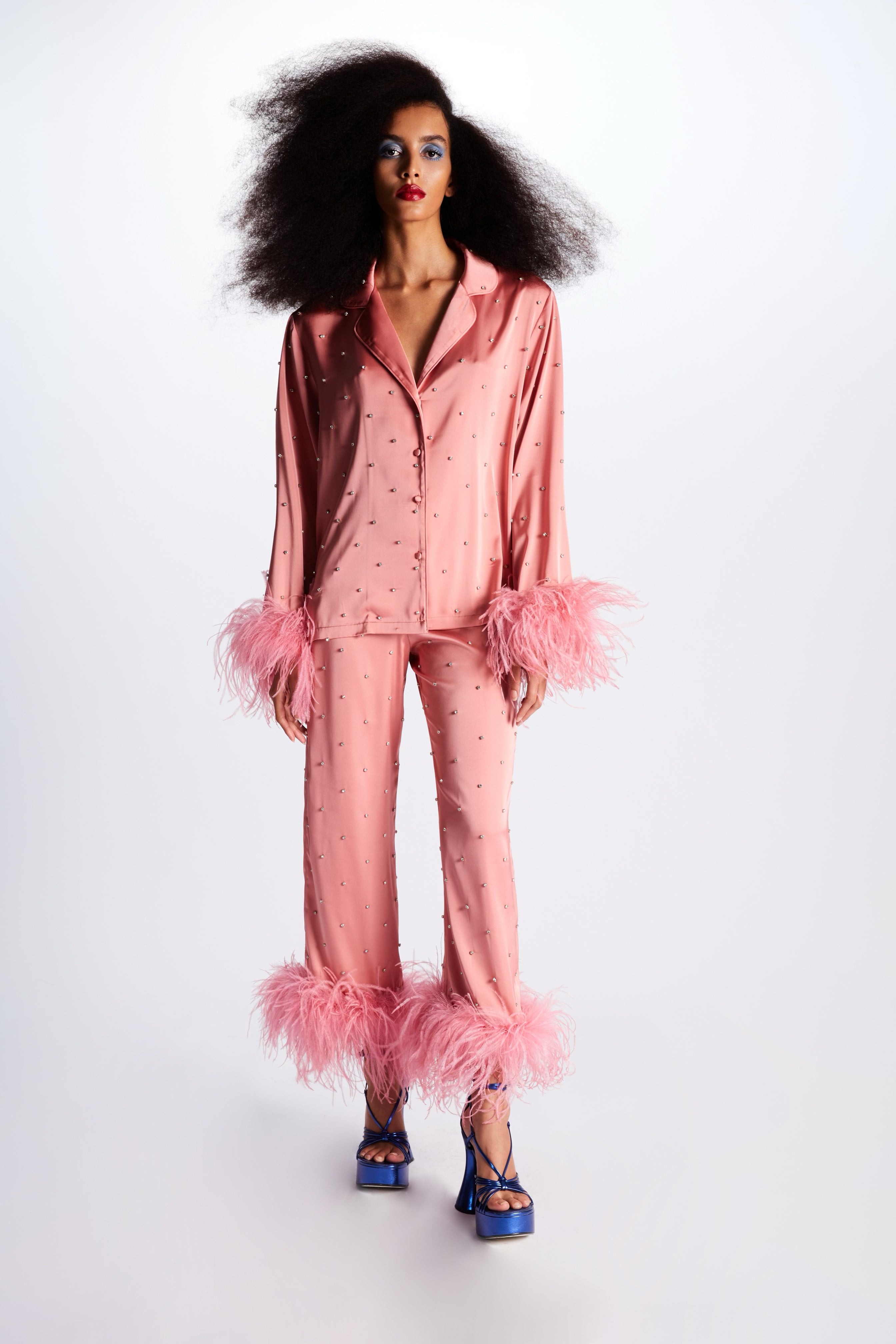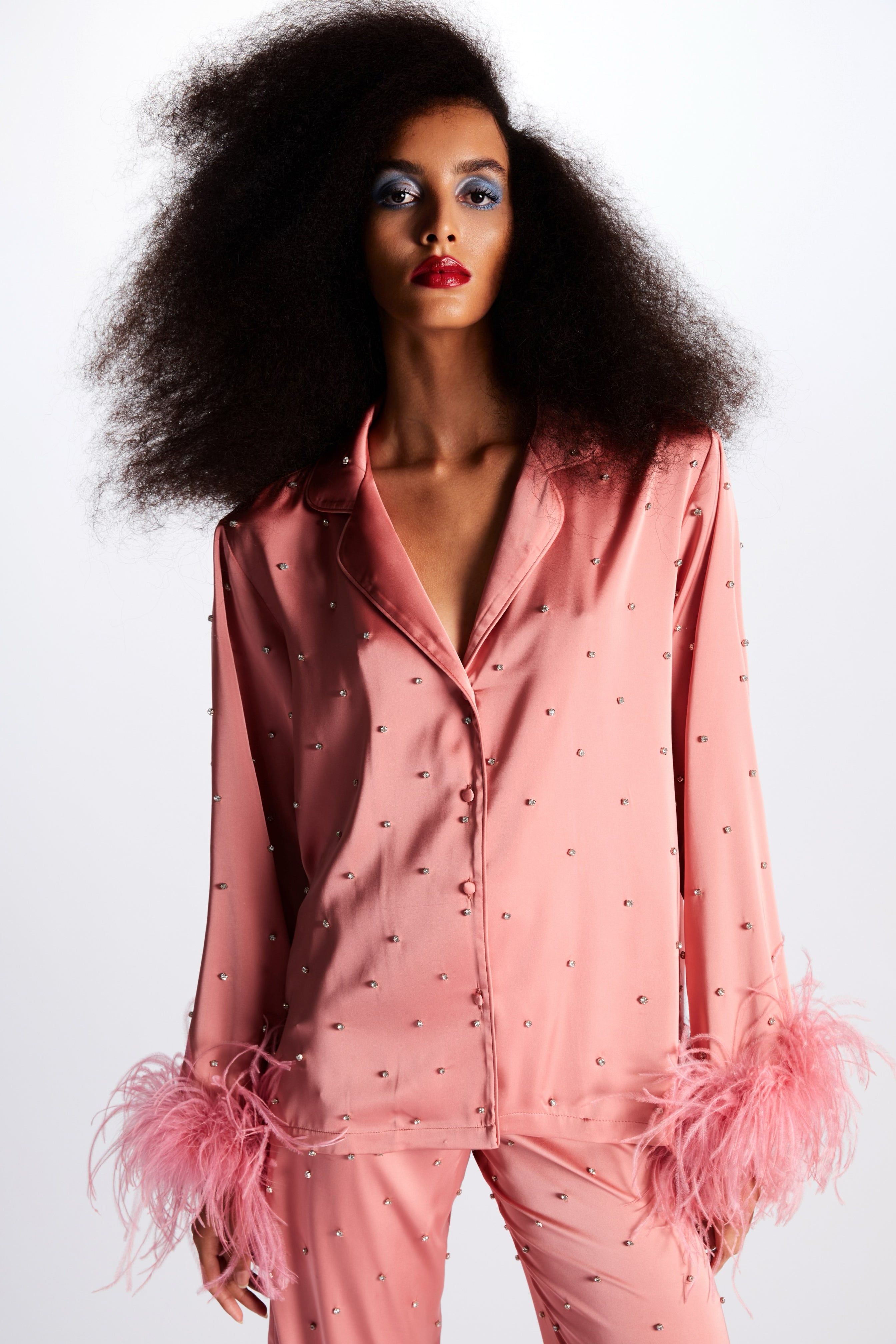 - Tessuto in raso di lycra rosa impreziosito da gioielli