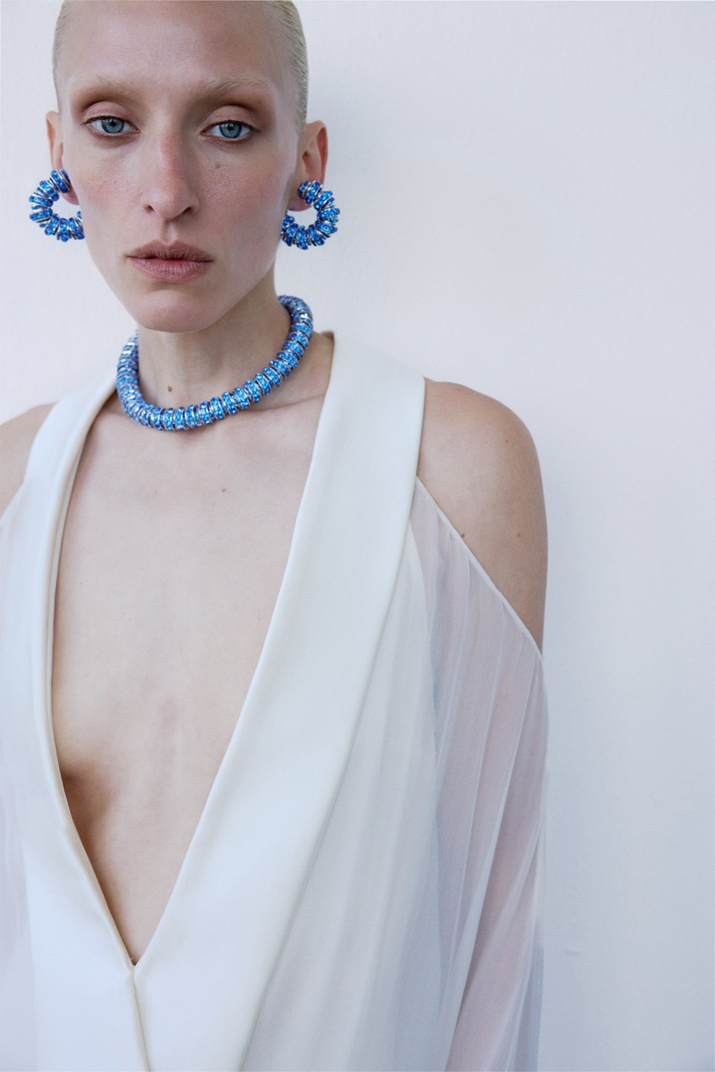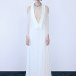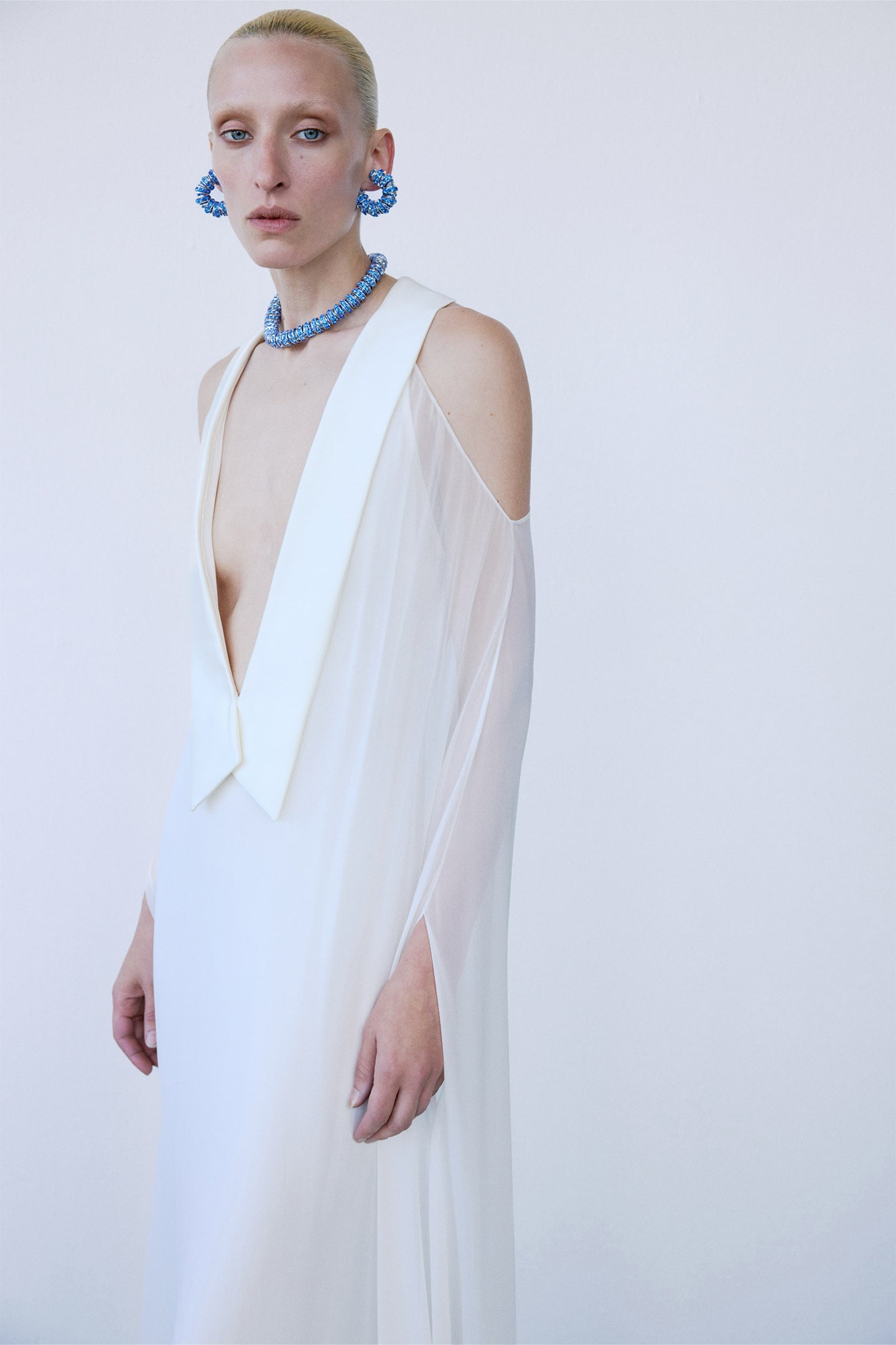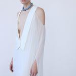 - Draped, cape-like sleeve effected