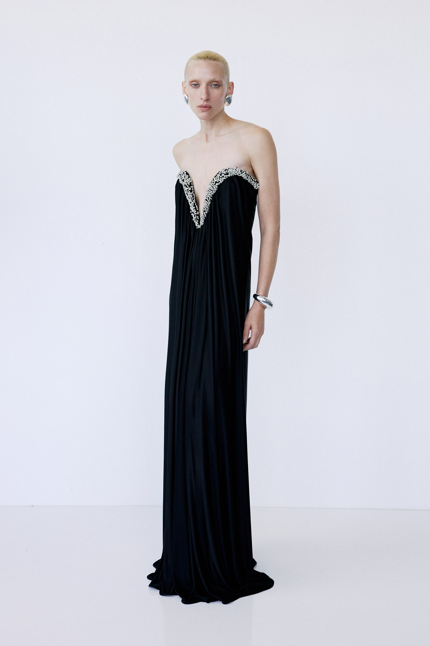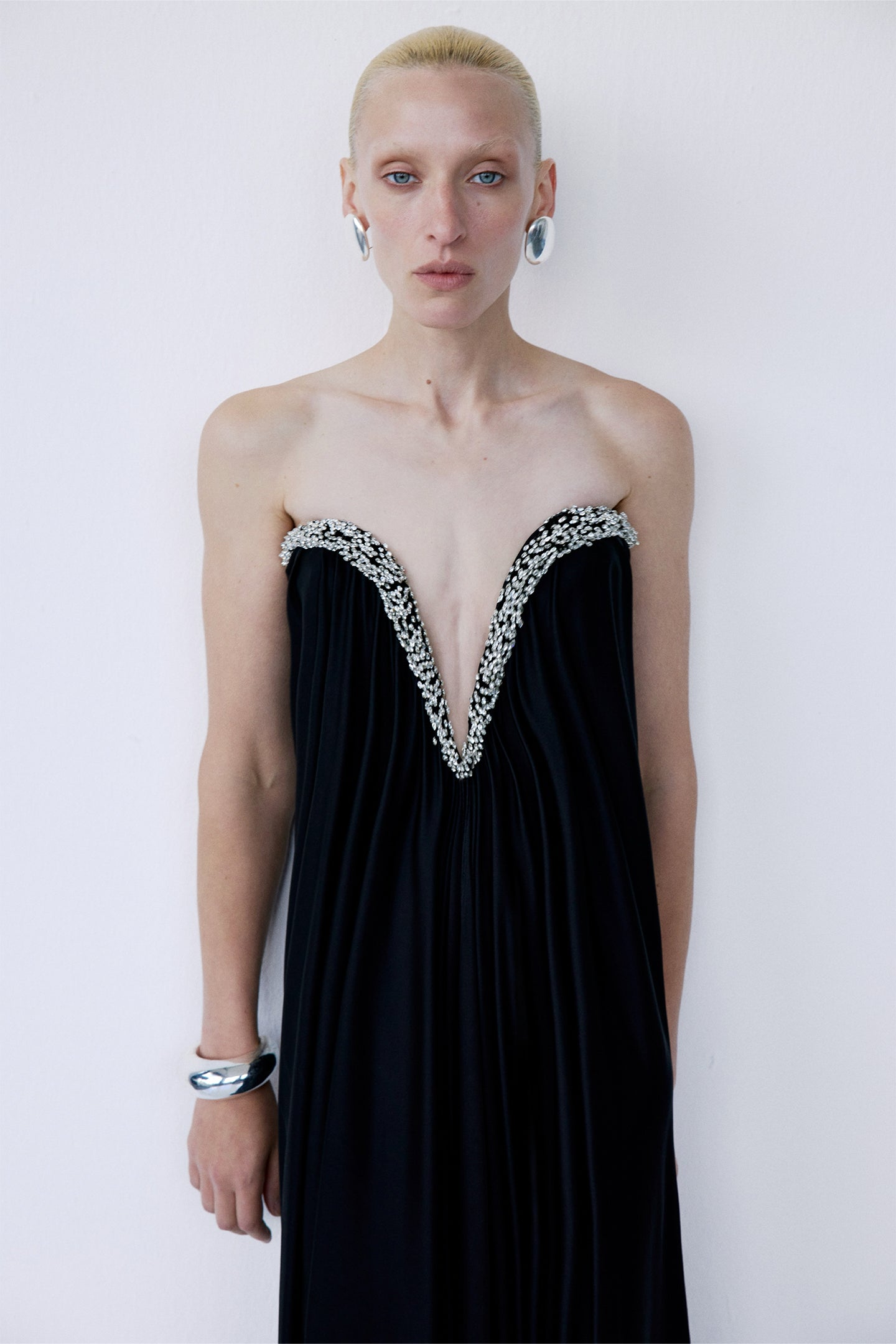 • Deep plunge neckline with soft gathered draping