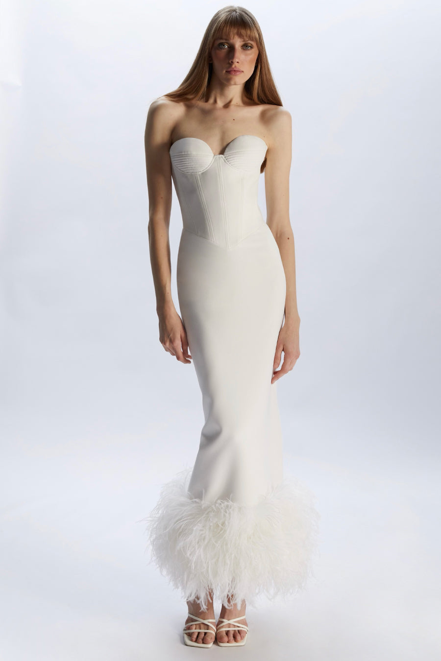 Tutte le piume sono piume di struzzo al 100%. Sono prodotte con il pieno impegno nel quadro della produzione sostenibile e provengono da allevamenti certificati. Conservare in un ambiente fresco e asciutto. Poiché le piume non sono sintetiche, è prevedibile che si verifichi una certa quantità di caduta. Tutte le piume sono cucite a mano all'abito. Prima di consegnare l'abito per la pulizia a secco, le piume devono essere rimosse e cucite di nuovo dopo che l'abito è stato pulito.