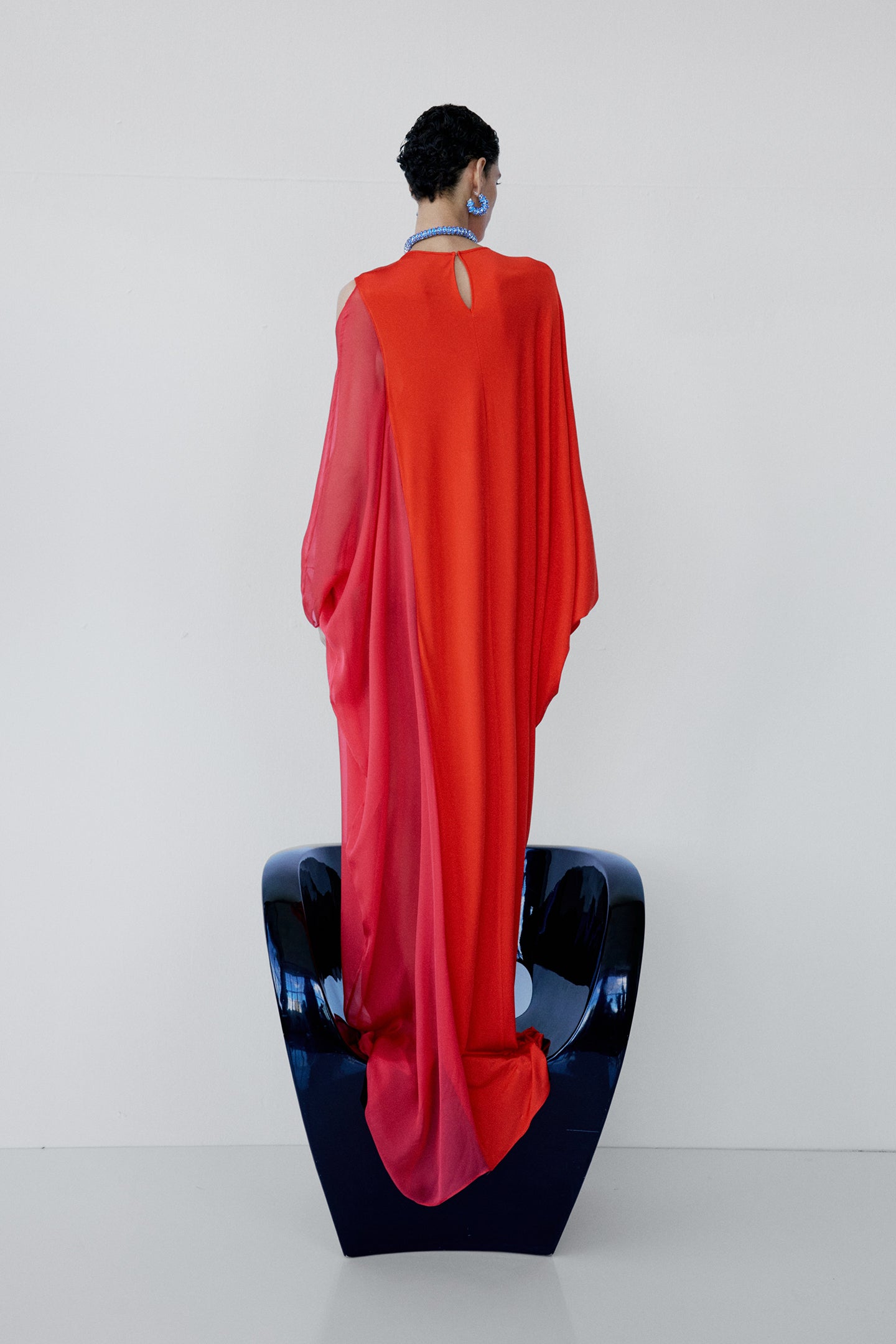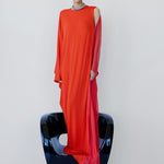 - Draped, cape-like sleeve effect on one side