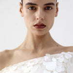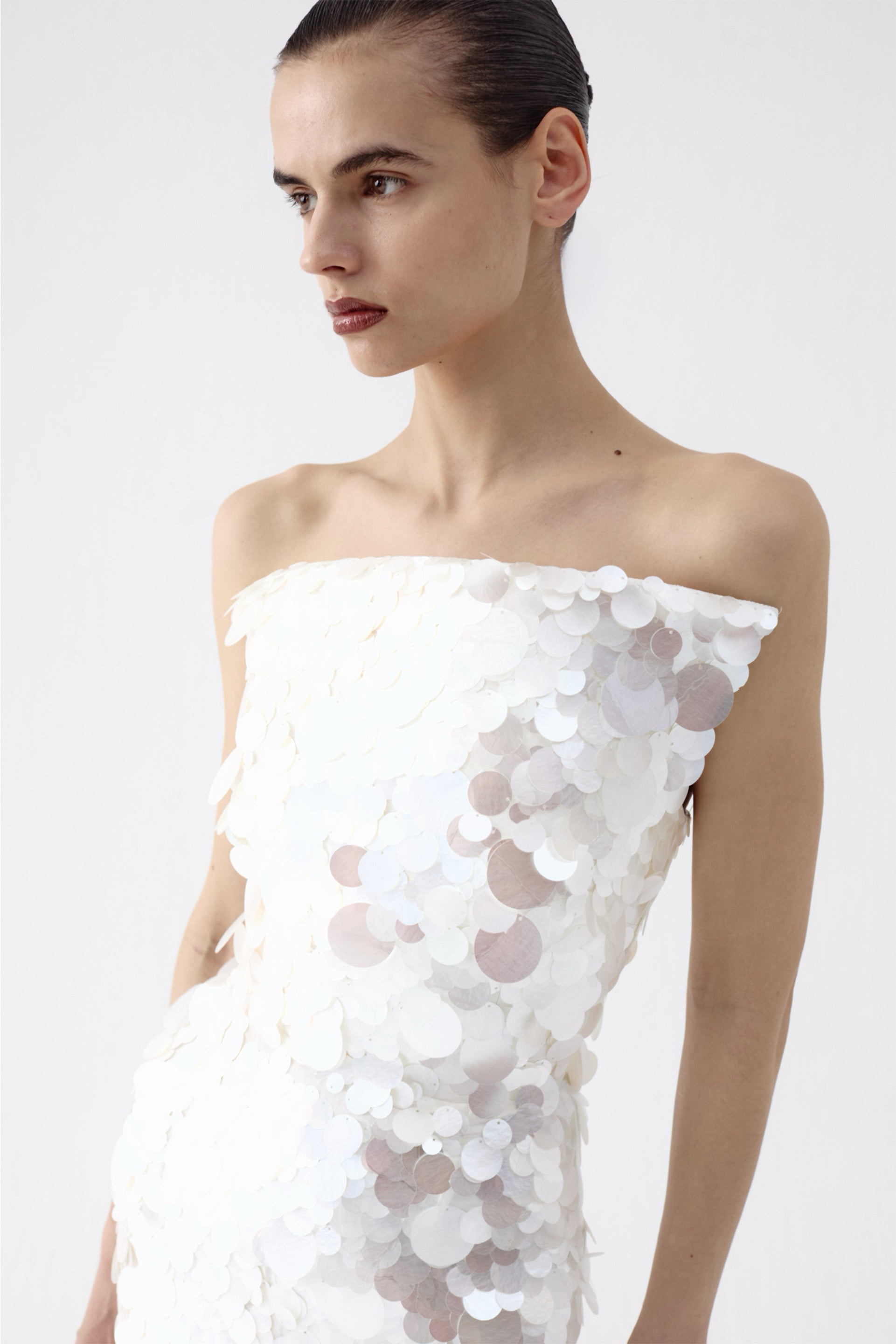 - Sequin surface with sculpted corset seams
