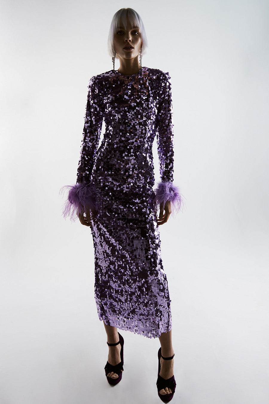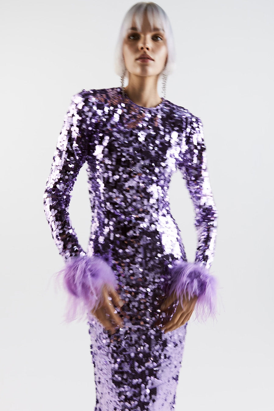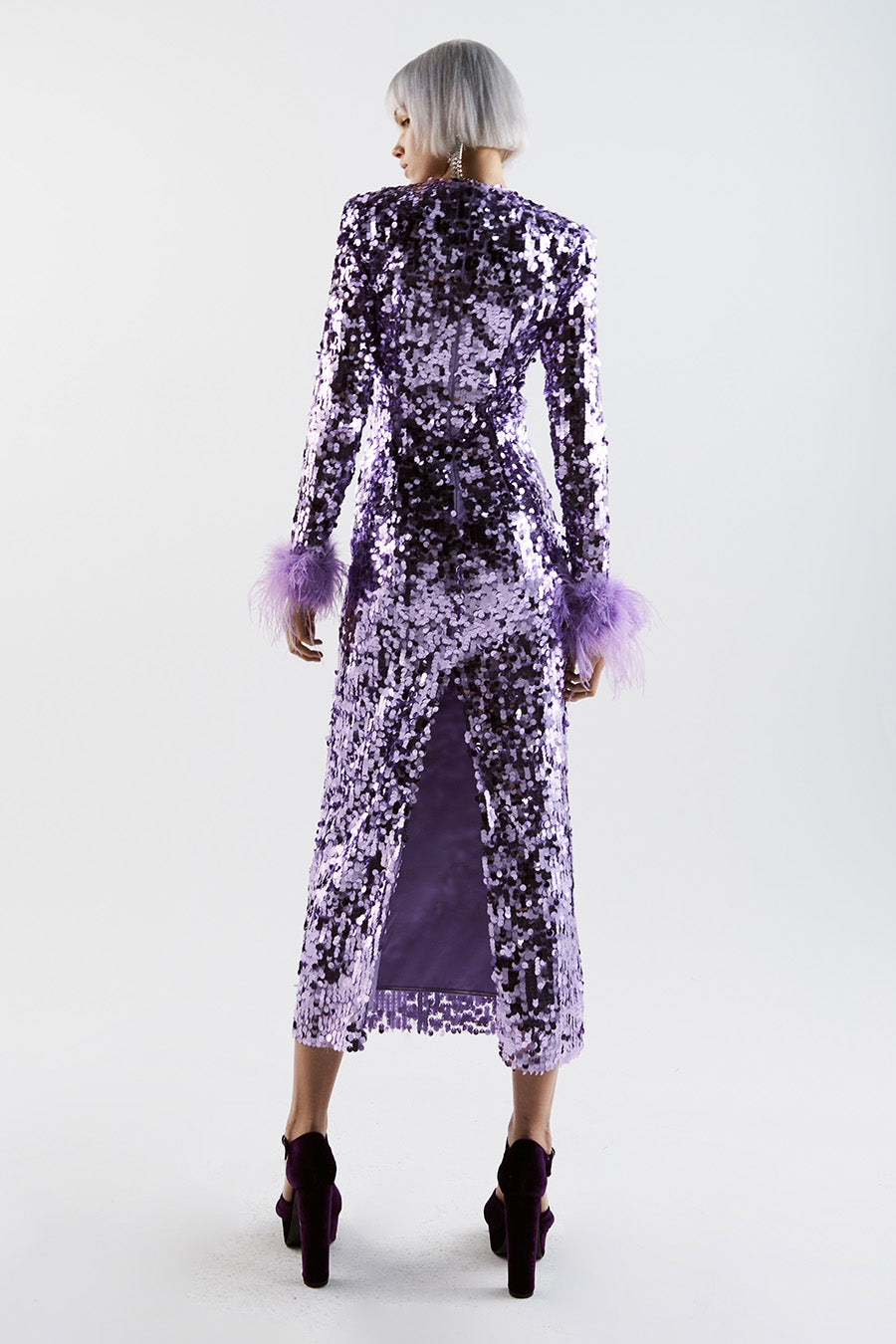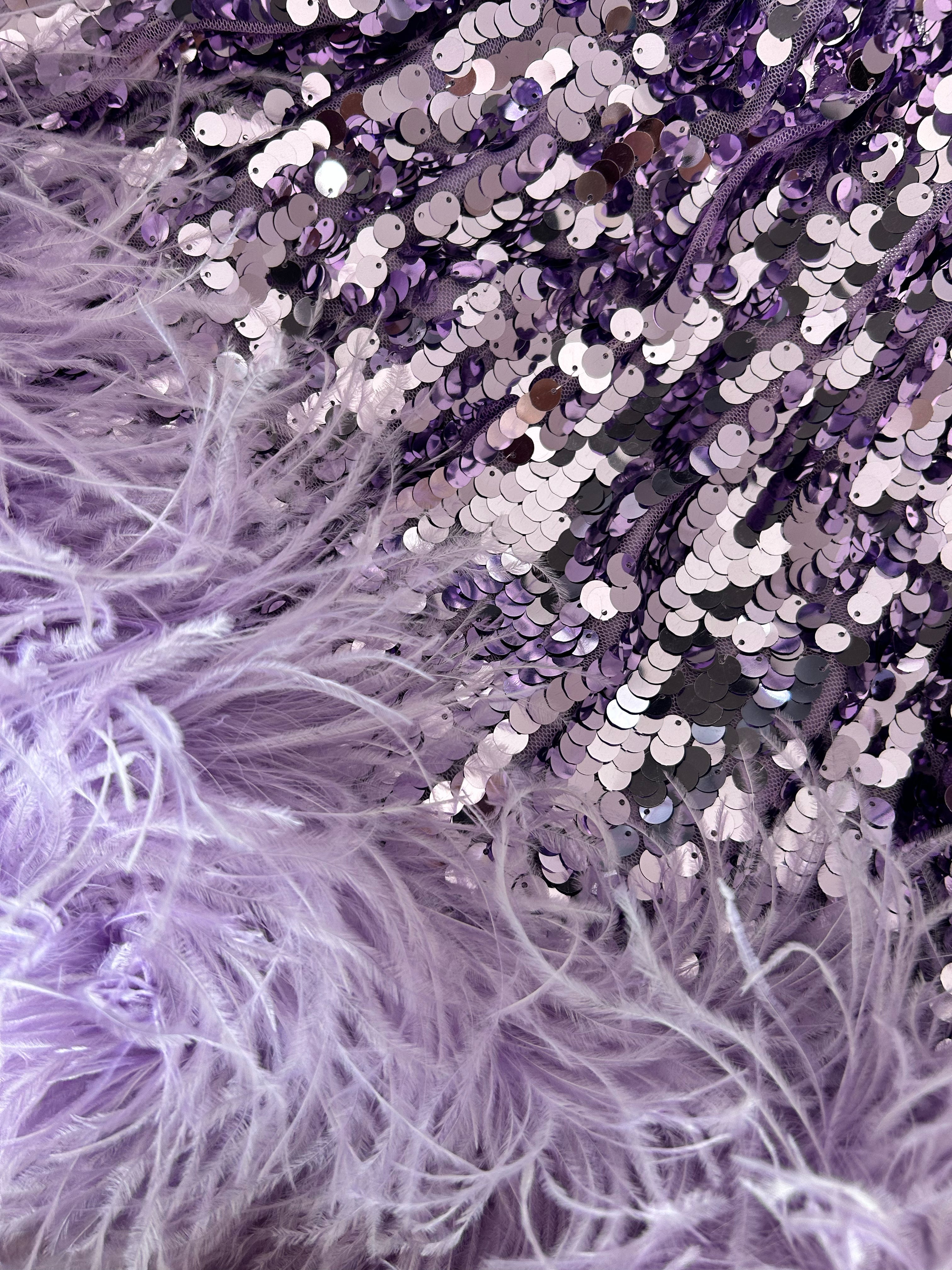 Tutte le piume sono piume di struzzo tinte al 100%. Sono prodotte con il pieno impegno nel quadro della produzione sostenibile e provengono da allevamenti certificati. Conservare in un ambiente fresco e asciutto. Tenere lontano da acqua e umidità per evitare scolorimento. Poiché le piume non sono sintetiche, è previsto che si verifichi una certa quantità di perdita. Tutte le piume sono cucite a mano all'abito. Prima di consegnare l'abito per la pulizia a secco, le piume devono essere rimosse e cucite di nuovo dopo che l'abito è stato pulito.