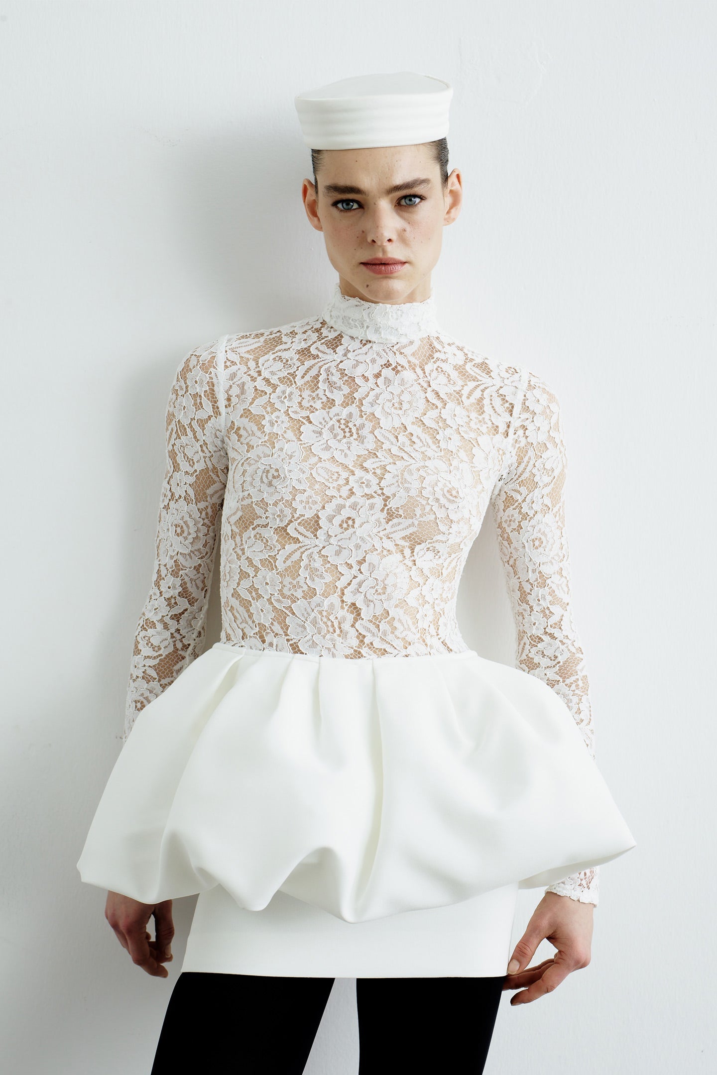 CATROUX MINI PEPLUM DRESS IN CHANTILLY LACE
