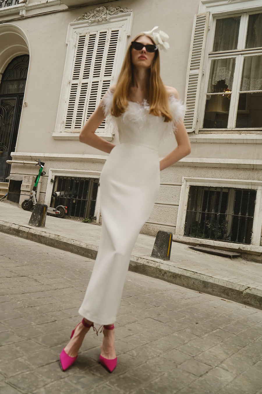 All of the feathers are 100% ostrich feathers. They are produced with full commitment to the framework of sustainable production and are supplied from certified farms. Store in a cool and dry environment. Since the feathers are not synthetic, it is expected that some amount of shedding will occur. All of the feathers are hand stitched to the dress. Before handing over the dress for dry cleaning, the feathers should be removed and sewn again after the dress has been cleaned.