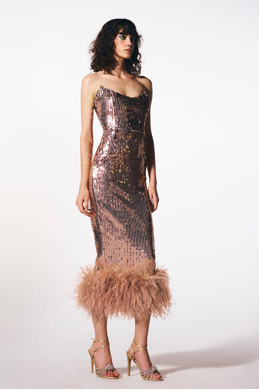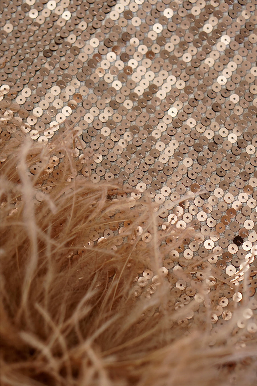 All of the feathers are 100% dyed ostrich feathers. They are produced with full commitment to the framework of sustainable production and are supplied from certified farms. Store in a cool and dry environment. Keep away from water and moisture to avoid discoloration. Since the feathers are not synthetic, it is expected that some amount of shedding will occur. All of the feathers are hand stitched to the dress. Before handing over the dress for dry cleaning, the feathers should be removed and sewn again after the dress has been cleaned.