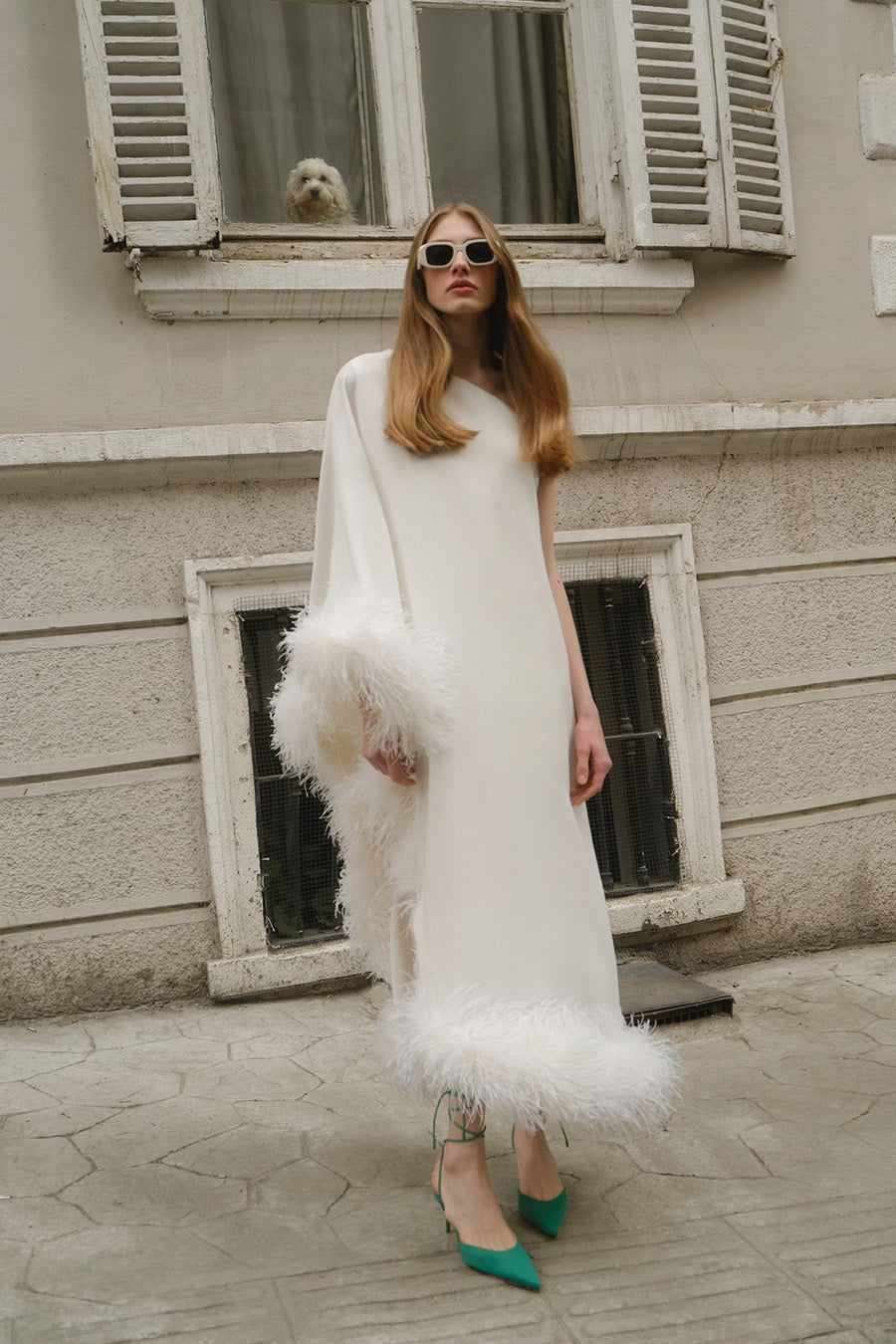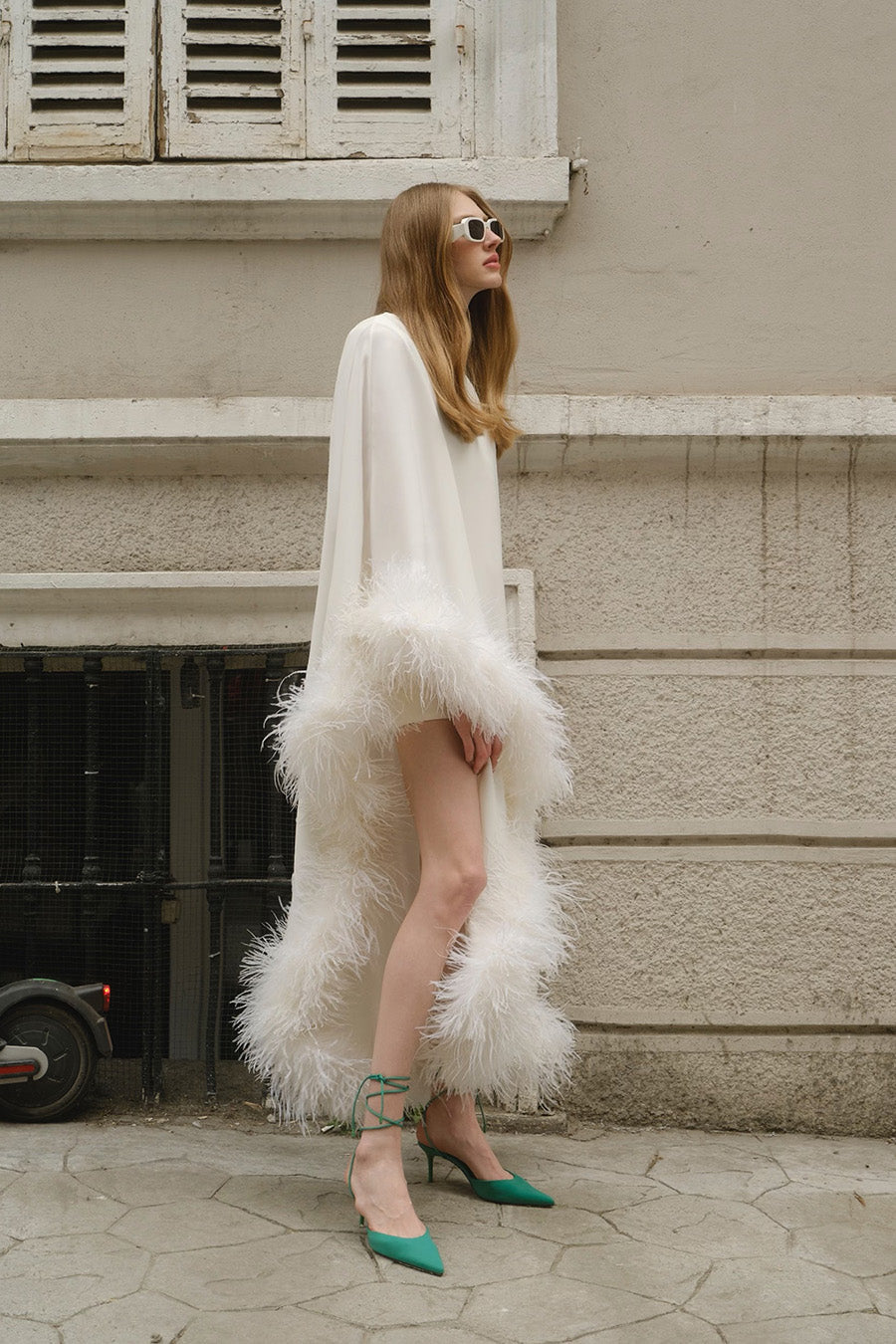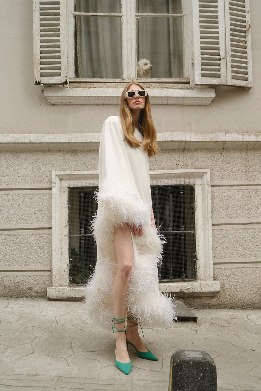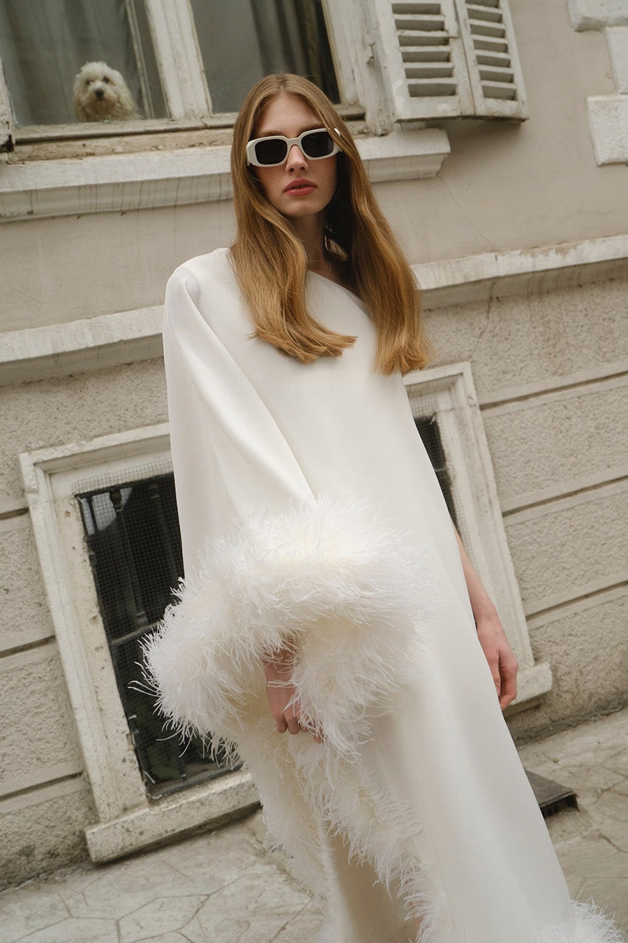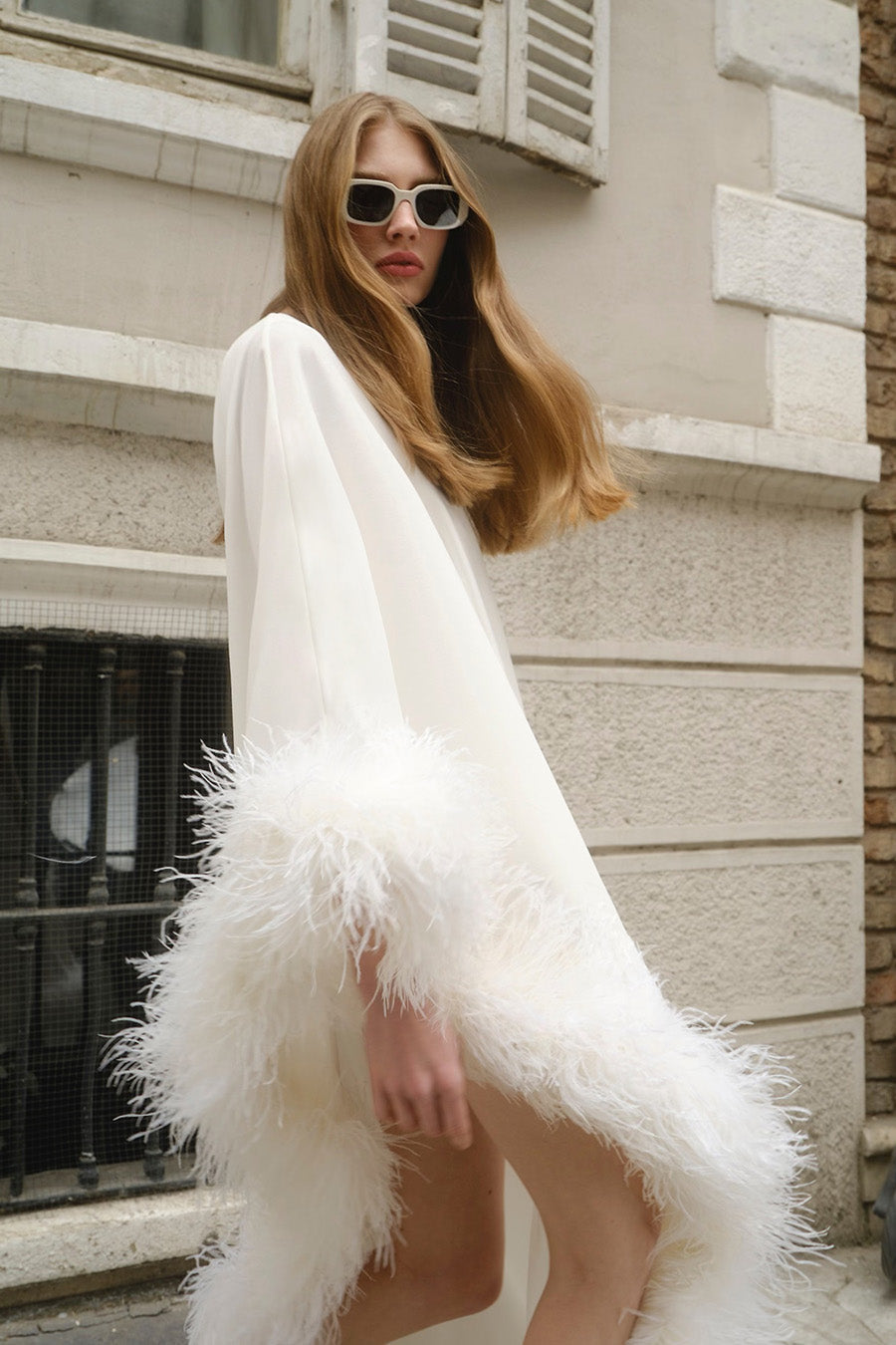 All of the feathers are 100% ostrich feathers. They are produced with full commitment to the framework of sustainable production and are supplied from certified farms. Store in a cool and dry environment. Since the feathers are not synthetic, it is expected that some amount of shedding will occur. All of the feathers are hand stitched to the dress. Before handing over the dress for dry cleaning, the feathers should be removed and sewn again after the dress has been cleaned.